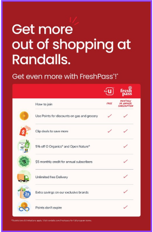Join the Randalls For U program to earn points and save on every purchase. Members also get access to exclusive deals in the Randalls weekly ad, so be sure to take advantage of these special offers.